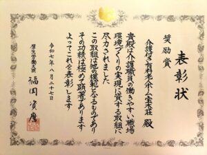 厚生労働省主催の令和7年度介護職員の働きやすい職場環境づくり内閣総理大臣表彰及び厚生労働大臣表彰が行われ、宝木荘は奨励賞を受賞しました。